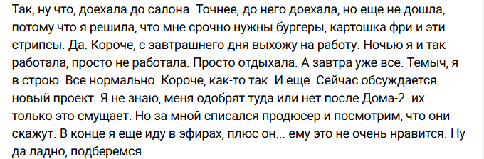 Шатает Клаву Ермакович из стороны в сторону. То она говорит, что с проекта уходит из-за больших чувств к бывшему парню, то на работу нужно в автосалон ходить каждый день, то с сыном время проводить чаще захотелось, теперь она стремится к большей популярности. А потом опять назад на телестройку попросится?