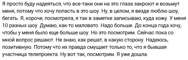 Ермакович очень хочет попасть на новый проект, она считает, что до конца года нужно это сделать, но боится из-за Дома 2 потерять свой шанс снова засветиться на телеэкранах.