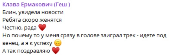 Прокомментировала Клавдия также новости про скорую свадьбу Игоря Григорьева и Кати Квашниковой - она на эту тему уже придумывает новый музыкальный трек. Все знакомые скоро будут завидовать Безверховой?