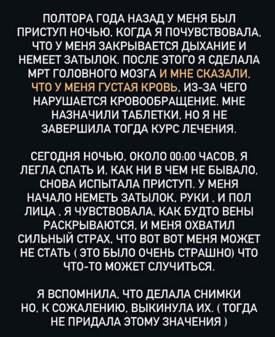 Бывшая участница Дома 2 Кристина Бухынбалтэ сообщила о проблемах со здоровьем. По словам Кристины Бухынбалтэ, у неё случился микроинсульт на нервной почве, что выяснилось после обследования в аппарате МРТ.