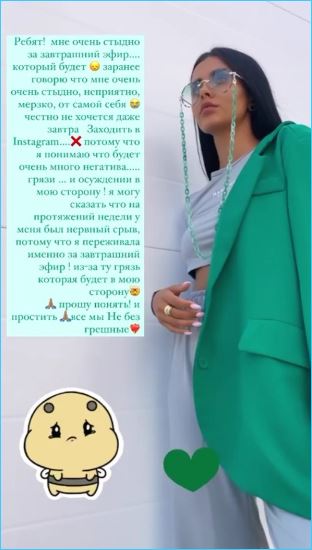 Предварительно показав диагноз "сотрясение мозга", теперь Кристина Бухынбалтэ заранее просит простить её за грязь в эфирах Дома 2, начиная с 28.07.2021. Девушка признается, что ей очень стыдно за своё поведение и боится даже открывать комментарии на своей странице в Инстаграм.