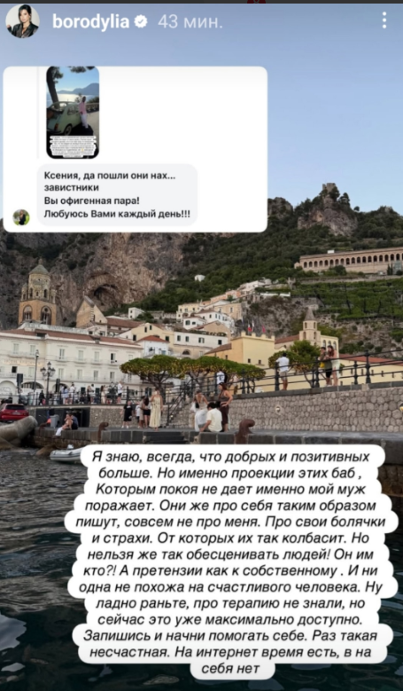 Ксения Бородина ждёт, когда желчные бабы отстанут от её мужа. Не секрет, что блогера Николая Сердюкова недолюбливают телезрительницы, в некоторых телеграм-каналах его обсуждают каждый день, смеясь, что он вытянул счастливый билет в виде богатой жены и хорошо пристроился.