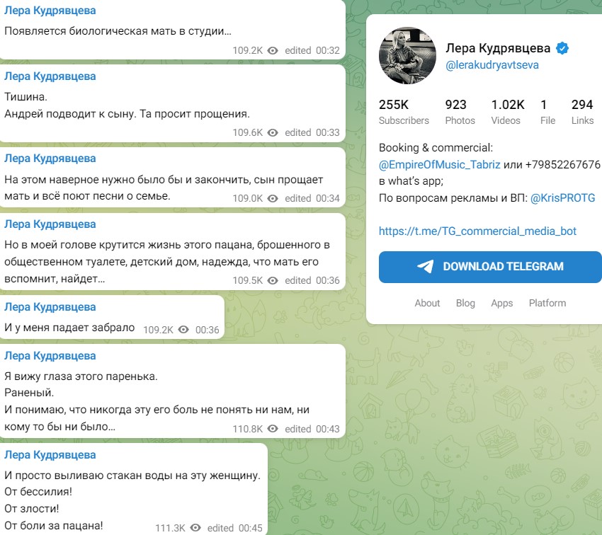 Лера по сей день с горечью вспоминает непростые съёмки, в ходе которых рассказ гостя программы тронул её до самой глубины души. И в тот самый момент, когда биологическая мать принесла сыну извинения, Кудрявцева не выдержала. Она в красках представила жизнь ребёнка, брошенного матерью в общественном туалете, и ей стало за него горько и обидно.