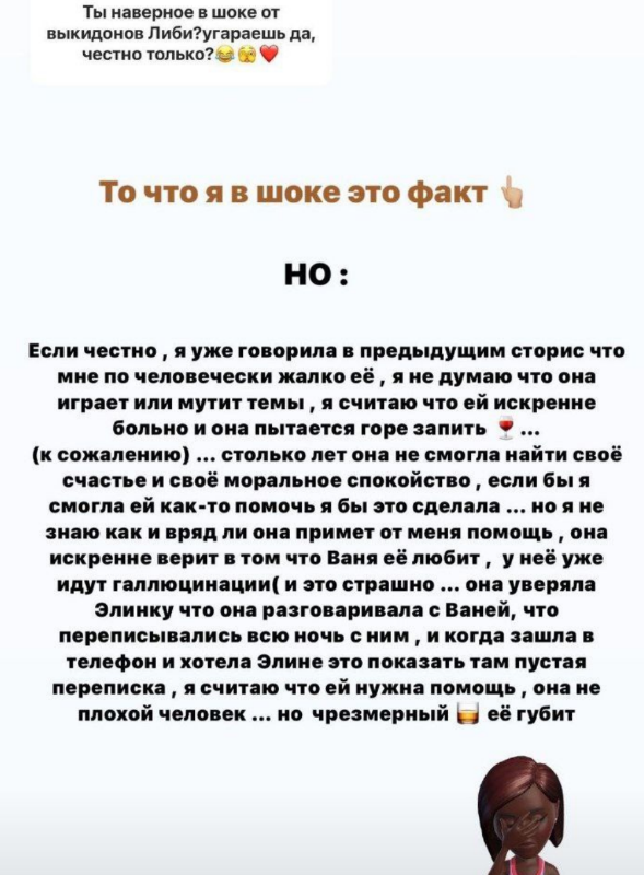 В любом случае, Либерж сама себя подставила тем, что пыталась сдружиться с Кристиной, а та первая начала выставлять видео и писать, что Либерж навеселе. Когда ещё в помине не было признаний Кпадону в любви длиной в 12 лет и нервного срыва, о котором мы писали на шлоке здесь.
