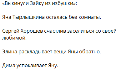 Сегодня любвеобильная Дорожкина выгнала Тырлышкину из "яббаровской" комнаты, Яна рыдала, её утешал Дмитрий Луковкин, а Сергей Хорошев отдыхал на мятых простынях, которые не менялись со времён унитазного шансонье, если верить слухам. Чему же так радуется Яна Фиткевич, называющая Тырлышкину "зайкой"?