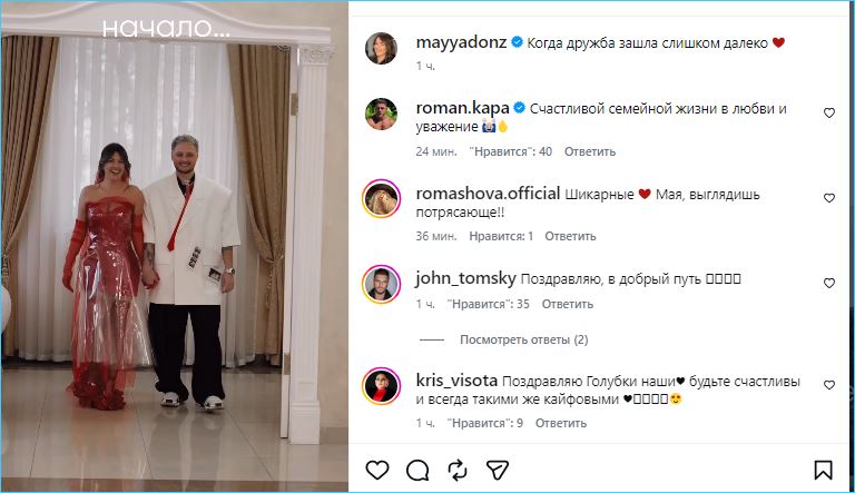 Поделилась в «нельзяграмме» Майя Донцова роликом, в котором они официально скрепили брак с её другом и бойфрендом Даном Подлецким, подчеркнув, что так бывает, «когда дружба переросла в любовь».