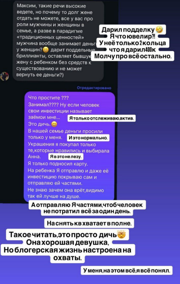 Бывший участник дома 2 Максим Евстропов прокомментировал слова своей жены о том, что он взял у неё 400 тысяч в долг и инвестировал в сомнительный проект, от которого не было прибыли. По словам Евстропова, он покрывает выплаты по этой сумме и не брал займ у собственной жены, а она по своей инициативе доверила ему сбережения.