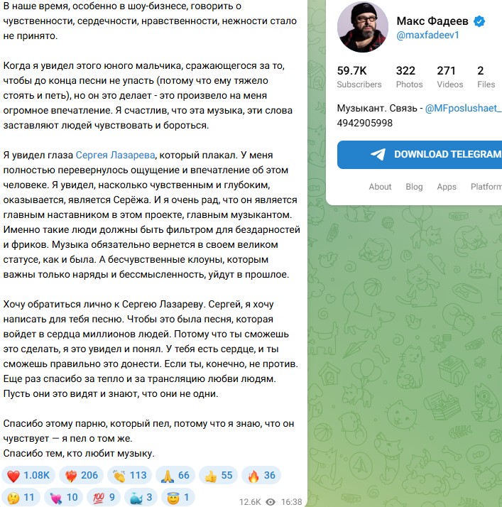 "Я увидел глаза Сергея Лазарева, который плакал. У меня полностью перевернулось ощущение и впечатление об этом человеке. Я увидел, насколько чувственным и глубоким, оказывается, является Серёжа. И я очень рад, что он является главным наставником в этом проекте, главным музыкантом. Именно такие люди должны быть фильтром для бездарностей и фриков. Музыка обязательно вернется в своем великом статусе, как и была. А бесчувственные клоуны, которым важны только наряды и бессмысленность, уйдут в прошлое.", - написал на своей странице Фадеев. "Хочу обратиться лично к Сергею Лазареву. Сергей, я хочу написать для тебя песню. Чтобы это была песня, которая войдет в сердца миллионов людей. Потому что ты сможешь это сделать, я это увидел и понял. У тебя есть сердце, и ты сможешь правильно это донести. Если ты, конечно, не против. Еще раз спасибо за тепло и за трансляцию любви", - обратился он к Лазареву.
