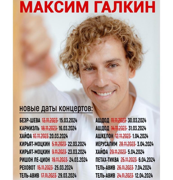 Как стало известно благодаря странице самого Максима Галкина в социальных сетях, концерты, которые планировалось провести в конце ноября текущего года, были перенесены на весну 2024 года. Как предполагает супруг Аллы Пугачёвой, к тому времени обстановка в Израиле стабилизируется, дав ему возможность выступить перед любимыми поклонниками.