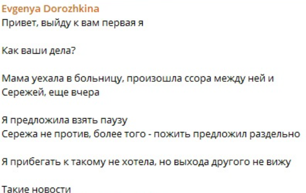 Сергей Хорошев и Евгения Дорожкина разъехались по разным углам Поляны. Сегодня Евгения вышла на связь с подписчиками и сообщила, что её мама попала в больницу после ссоры с Хорошевым. Подробности Женя не рассказывает, возможно, лечение было запланированным.