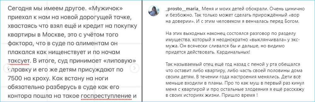 Еще в большей степени вызывает гнев Маши то обстоятельство, что все её махинации с квартирами и домом, сумел разгадать второй бывший муж, на которого она не перестает жаловаться в социальных сетях.