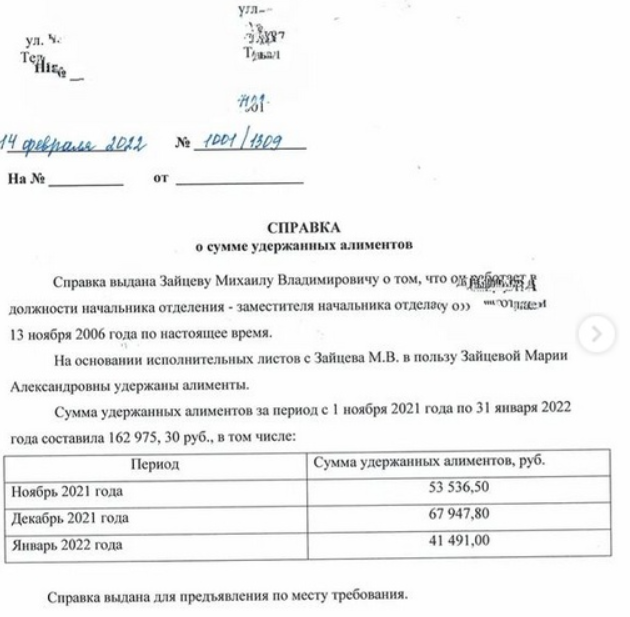 У Михаила Зайцева закончилось терпение. Он показал справку с работы о выплате алиментов и выяснилось, что с его зп удерживают в месяц 50-60 тысяч рублей, а не 7500 на одного ребенка, о чем говорила Круглыхина. Также он заметил, что в заявлении, которое составляла на него Мария, указано, что она находится на иждивении матери и живет без пособий, а Михаил обладает информацией, по которой она за полгода зарабатывала по 6 млн рублей.