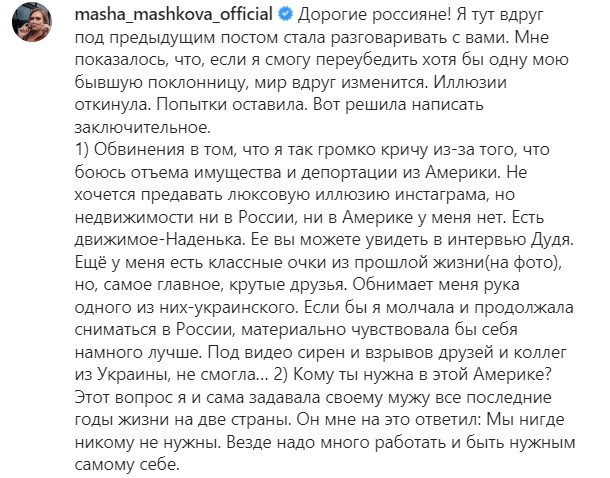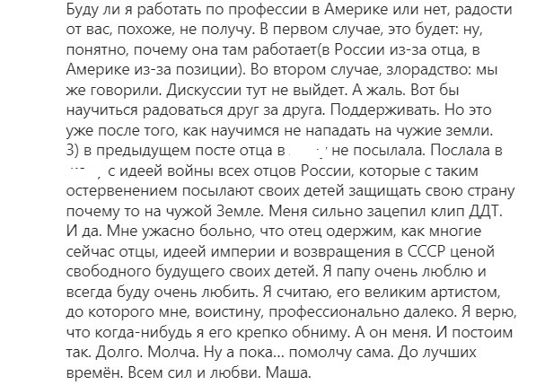 Когда в комментариях в очередной раз была задета актёрская деятельность Машковой и её заработки в России, она не выдержала, написав большой пост на своей странице в социальных сетях. Так она поторопилась объяснить свою позицию по отношению к спецоперации, обвинив своего же отца в одержимости. Как считает Мария, её отец, как и многие другие отцы сейчас, одержим "идеей империи и возвращения в СССР ценой свободного будущего своих детей".