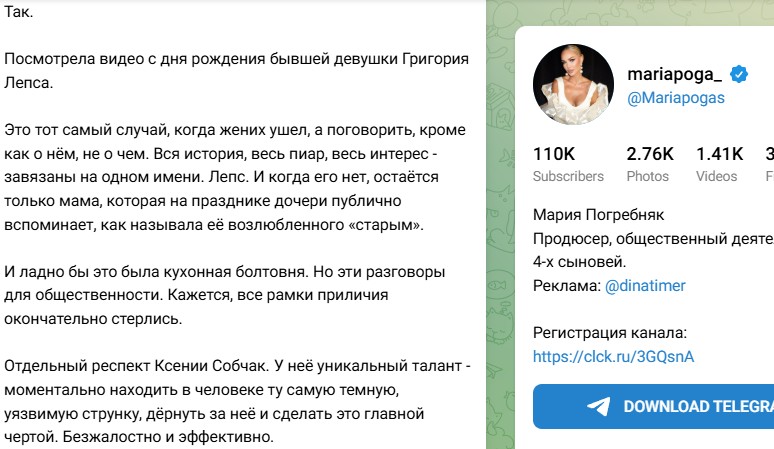 "Это тот самый случай, когда жених ушел, а поговорить, кроме как о нём, не о чем. Вся история, весь пиар, весь интерес - завязаны на одном имени. Лепс. И когда его нет, остаётся только мама, которая на празднике дочери публично вспоминает, как называла её возлюбленного «старым»(орфография и пунктуация автора сейчас и далее сохранены)", - написала на своей странице в социальных сетях Мария. "И ладно бы это была кухонная болтовня. Но эти разговоры для общественности. Кажется, все рамки приличия окончательно стерлись.", - добавила она. Погребняк добавила, именно Ксении Собчак удалось найти в представителях семьи Кибы "самое тёмное". "Отдельный респект Ксении Собчак. У неё уникальный талант - моментально находить в человеке ту самую темную, уязвимую струнку, дёрнуть за неё и сделать это главной чертой. Безжалостно и эффективно.", - подытожила Мария.
