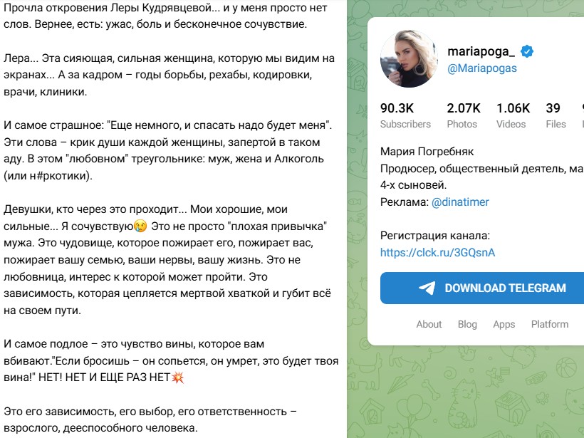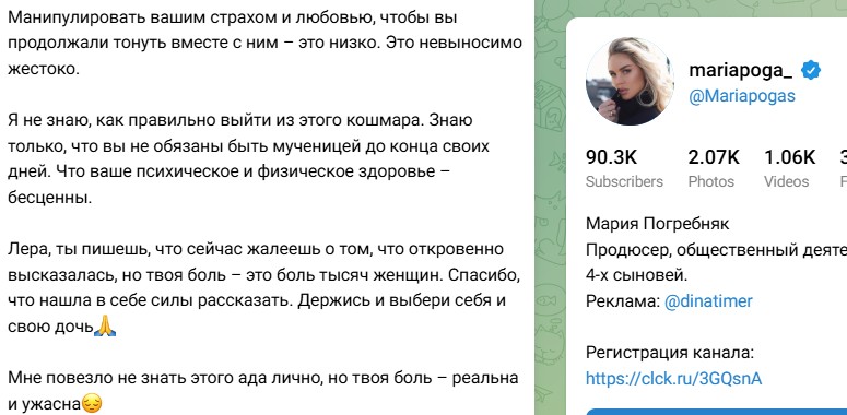 Мария Погребняк отреагировала на крик души Леры Кудрявцевой, прокомментировав поведение человека, вынуждающего телеведущую "тонуть" вместе с ним. Мария призналась, последние посты Леры произвели на неё неизгладимое впечатление - она и представить себе не могла, что Кудрявцева живёт в таком "аду". "Прочла откровения Леры Кудрявцевой... и у меня просто нет слов. Вернее, есть: ужас, боль и бесконечное сочувствие. Лера... Эта сияющая, сильная женщина, которую мы видим на экранах... А за кадром – годы борьбы, рехабы, кодировки, врачи, клиники(орфография и пунктуация автора сейчас и далее сохранены)", - написала на своей странице в социальных сетях Погребняк.