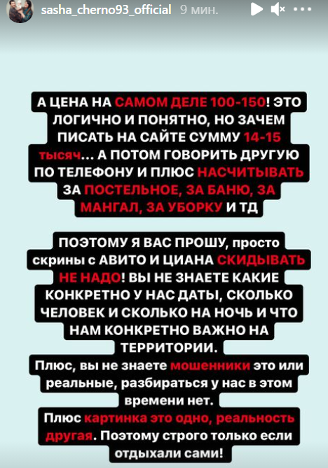 Почитав о Черно в социальных сетях, арендодатели, возможно, хотят сразу получить сумму и за аренду и на покрытие будущего ремонта. А вдруг бывшие участники дома 2, собравшиеся в большом количестве, устроят погром? Кто пустит к себе в дом 40 человек? А кто оплатит потом услуги клининговой компании и будет с территории неделю выгребать конфетти? А ещё Иосифу Мартыновичу и Йосе скорую могут вызвать, беременные придут на последнем сроке, маленькие дети появятся на дне рождения без контроля родителей...