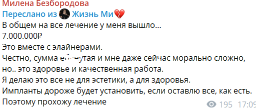 Бывшая участница телепроекта Дом 2 Милена Безбородова призналась подписчикам, что потратила на лечение и выравнивание зубов около 7 млн рублей. Она прошло множество обследований, но не правилась с главной проблемой, поэтому вынуждена поставить виниры.