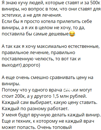 Зрители Дома 2 считают, что Милену "разводят" на деньги, но она уверена, что платит за качество и красоту, а если выбирать вариант дешевле, то долго виниры держаться не будут. Если вспомнить, как мы обсуждали на шлоке историю Саши Черно, у которой недорогие виниры, то Александра несколько раз меняла один винир на переднем зубе.