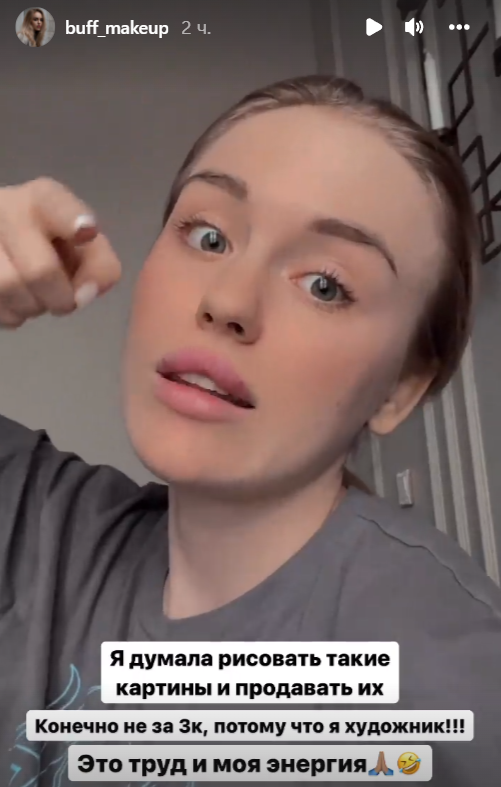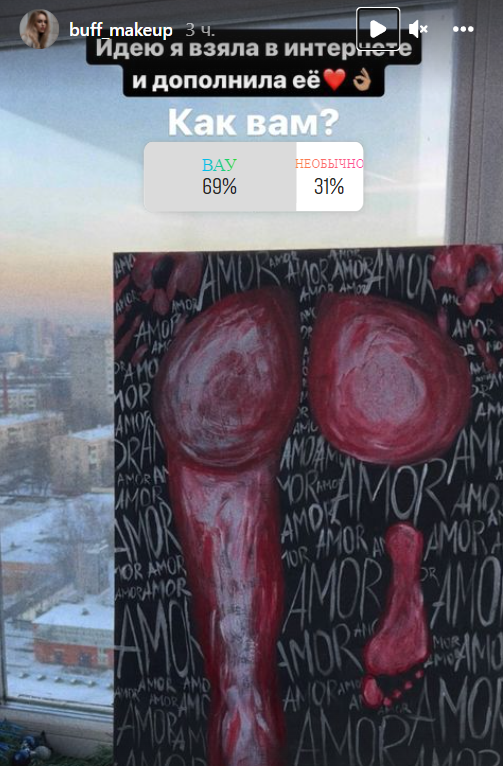 Милена нарисовала картину своим телом, затем раскрасила её в современном стиле, следуя советам из социальных сетей. Современное направление в живописи, называемое "word art" вперемешку с "авангардизмом", достаточно популярно и такие картины неплохо продаются.