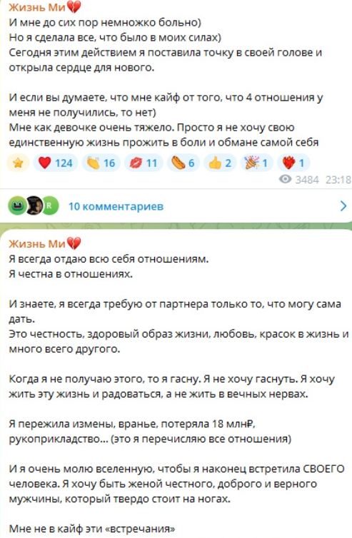 Подписчицы поддерживают Милену, у каждой из них есть похожая история, которыми они делятся в её телеграм-канале. В следующий раз точно повезёт Безбородовой?