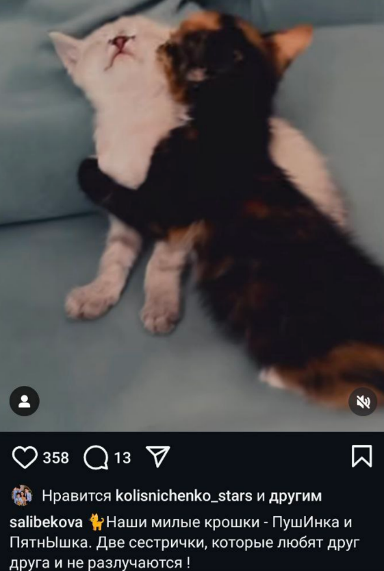 Колисниченко называет своих котят сестричками и делает акцент на то, что они неразлучны и остались без мамы. Возможно, после прохождения обучения на психолога Юлия, взяв в квартиру животных, закрывает гештальт, как известно, она часто говорит, что они с сестрой-близняшкой Катей рано стали самостоятельными и остались без мамы, а отец с ними не жил, у него была другая семья. Сейчас Юлия редко общается с сестрой, о чем мы рассказывали на шлоке, Катя считает свою близняшку токсичной и несущей в её жизнь негативные эмоции.