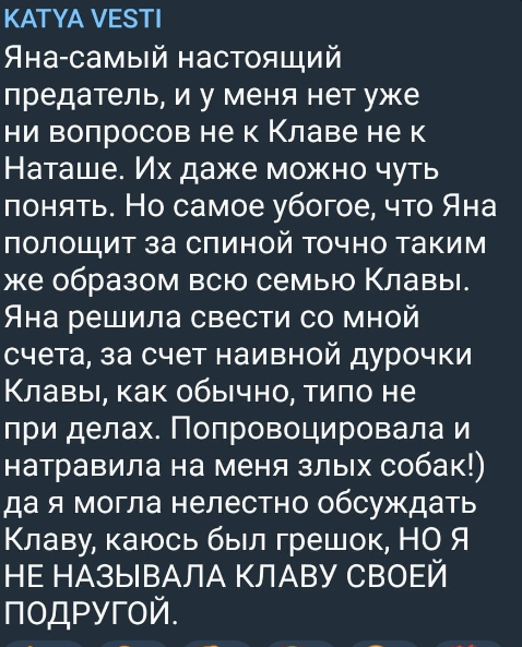 Горина также утверждает, что Яна Захарова её подставила и настроила Безверховых на травлю в социальных сетях. А Яна, как мы уже писали на шлоке, подаёт на Катерину заявление в суд.