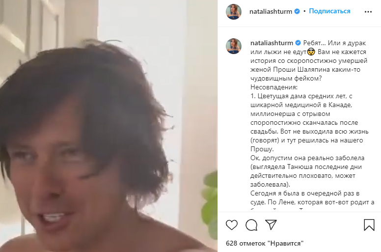 Наталья Штурм поделилась своей версией произошедшего, где Прохор Шаляпин стал невольным участником хитроумного плана юристки. По мнению певицы, Татьяна могла иметь финансовые проблемы, которые можно было решить лишь внезапной кончиной. Также Наталья поставила под сомнение невовремя оказанную медицинскую помощь, о которой Прохор говорил в одном из выпысков известного телешоу. "Цветущая дама средних лет, имея доступ к шикарной медицине, внезапно скончалась после свадьбы. Вот не выходила всю жизнь замуж, а тут решила." , - поделилась она своими сомнениями.