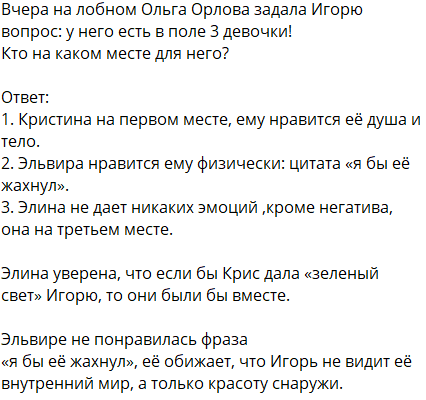 Странно, что за три недели общения Элина смогла так сильно полюбить Григорьева, который на проекте играет определенную роль и Рахимова об этом знает.