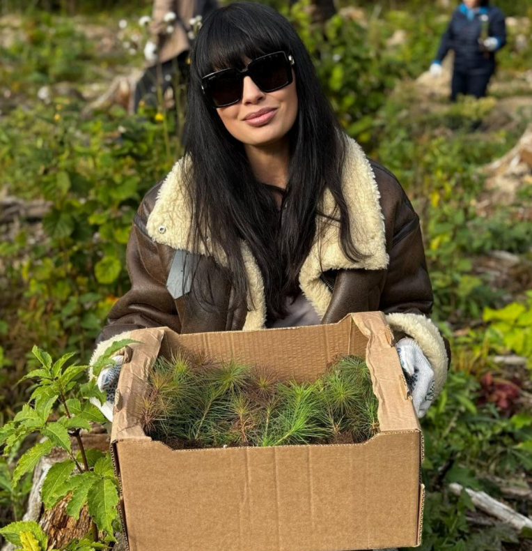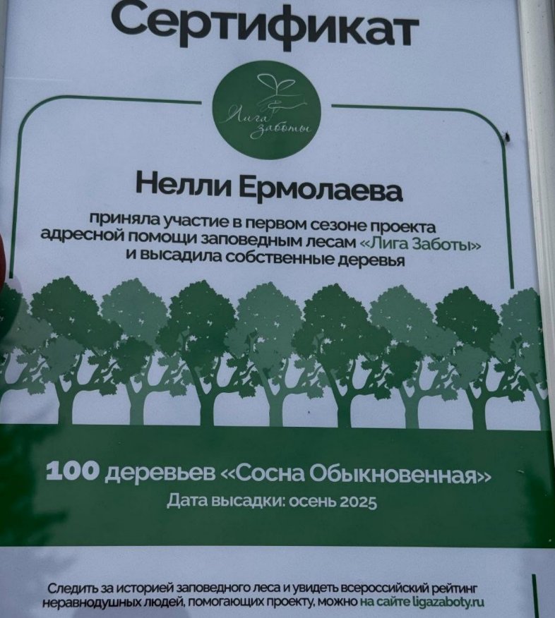 Ермолаева своими руками высадила 100 сосенок и получила сертификат участника. Телеведущая и актриса уверена, что каждый человек мог бы последовать её примеру и общими усилиями люди смогут улучшить экологическую ситуацию в стране.