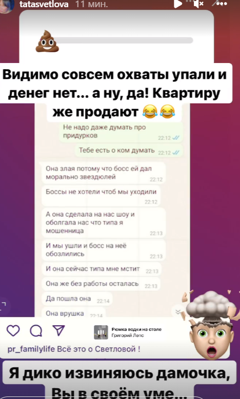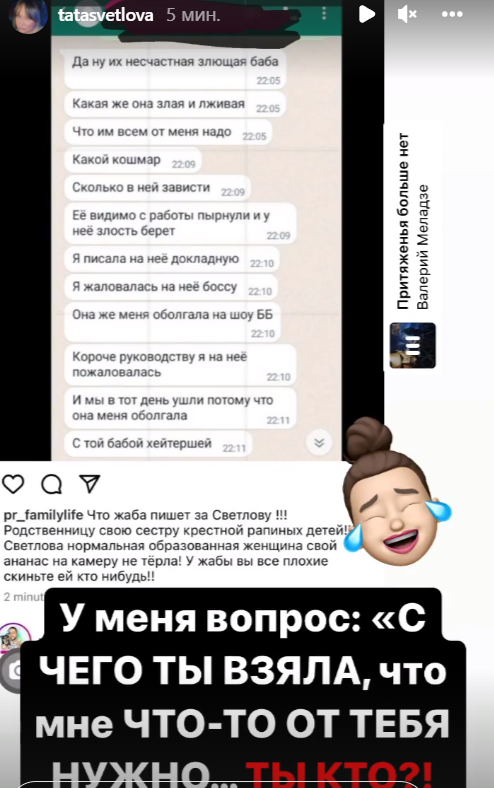 Бывший продюсер ББ Шоу Татьяна Светлова узнала от её подписчиков, что Ольга Рапунцель разносит про неё слухи и нелицеприятно отзывается в переписке с подписчиками. Эту ситуацию Светлова не хочет пускать на самотёк и готовит речь, изобличающую семью Дмитренко. Чуть позже поделимся с вами на шлоке подробностями нового конфликта, искусственно созданного Рапунцелями с сестрой крёстной их дочерей Василисы и Софии.