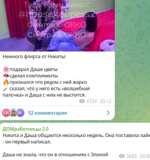 Интересно, кто это Никите посоветовал сразу с пошлостей начинать? Судя по тому, как Дарья слушает Гуранду, по её закрытой позе, парень для неё лишь проходной билет на телепроект Дом 2. Доверия к нему нет ни у Даши, ни у Элины, ни у ведущих Дома 2, о чем мы рассказывали на шлоке.