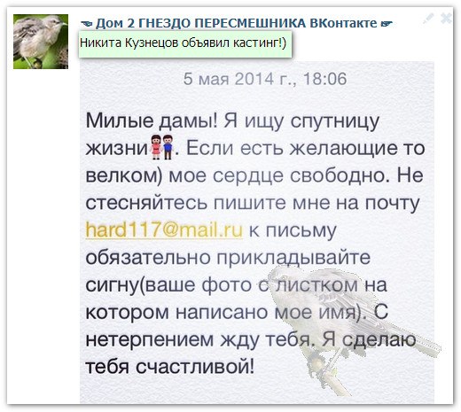 Никита Кузнецов объявил кастинг. Эти и другие последние новости и слухи дома 2 от сайтов: колючка, контрастный, гестигра, дом 2 тв и прочих фан сообществ читайте на страницах шлока.