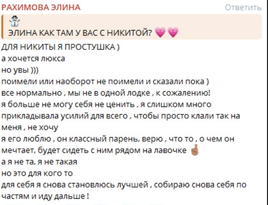 На протяжении 8 месяцев отношений Никита намекал, что Элина не подходит его семье, как невестка, он ещё не нагулялся и жениться рано. Элина наконец-то нашла в себе силы отпустить Гуранду и думает, что он считает её простушкой. Недостойной его по каким-то показателям. Зачем тогда ездил в гости к её родителям? Или там и понял, что нужно искать девушку выше статусом?