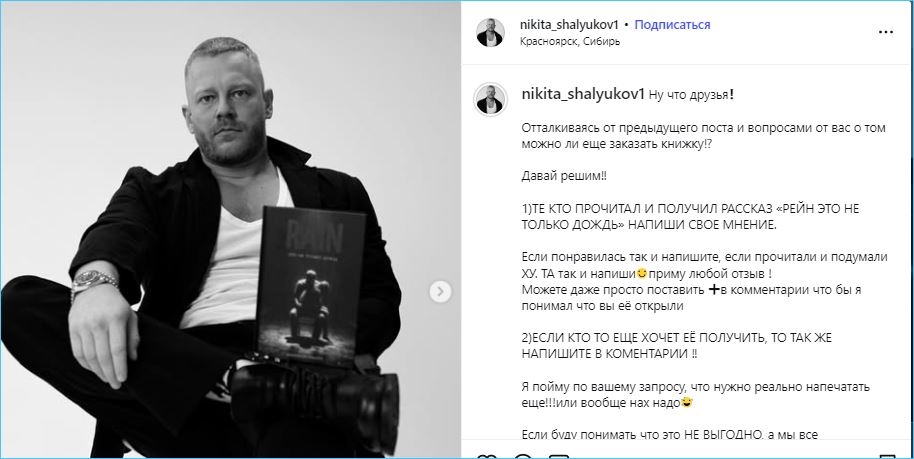 В дальнейшем Никита Шалюков сосредоточился на съемках в кино и телесериалах, и накопил солидный опыт в этой сфере, хотя на проект пришел из КВН. Этот свой опыт и решил Никита использовать в литературном творчестве. Надеемся, что у него получится лучше, чем у Ольги Бузовой, с книгой полностью прогоревшей.