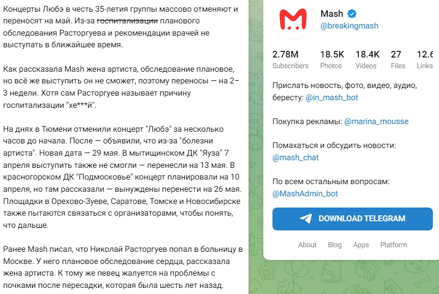 Как сообщает издание gazeta.ru, Николай Расторгуев поторопился опровергнуть свою госпитализацию, назвав разносчиков слухов нехорошим словом. Лидер группы "Любэ" обратил внимание на пост телеграм-канала Mash, где уточнялась информация, якобы поступившая от лица супруги музыканта. "Как рассказала Mash жена артиста, обследование плановое, но всё же выступить он не сможет, поэтому переносы — на 2–3 недели. Хотя сам Расторгуев называет причину госпитализации "хе***й".", - появился в Сети уже отредактированный пост.
