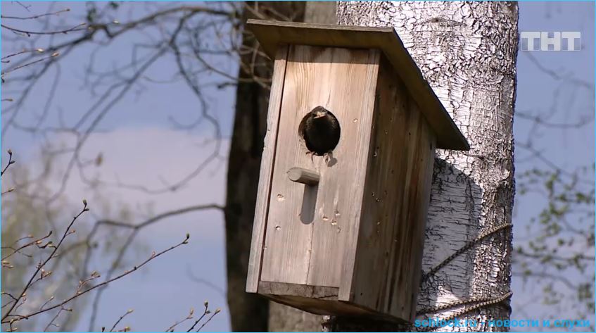 На поляне не только стройка, но прилетели скворцы. Один выселил белочку и еще не знает куда он попал.