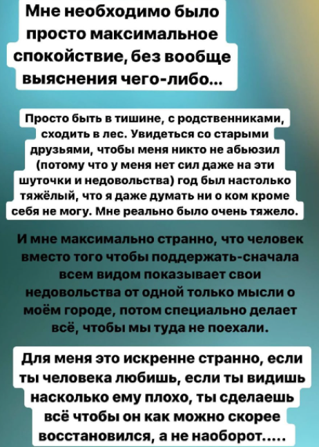 По словам Саши Черно, Оганесян третий год подряд портит ей Новый год, он не понимает, как супруга устала за прошедший 2021 год и сколько у неё было нервотрёпки, как ей необходим этот отдых и не обращает внимания на её слёзы. Ни о ком, кроме себя, Черно думать сейчас не может и её доводит до истерики мысль, что любимый человек не понимает, что ей плохо и тяжело, специально раздражает и делает вид, что ему неприятно одно упоминание её родного города.