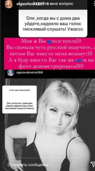 Орлову раскритиковали за её голос и попросили уйти из ведущих Дома 2. На это Ольга ответила, что женщина, которая дает ей подобные советы, неграмотна и единственный способ для недоброжелательницы самоутвердиться - выставить бюст в социальных сетях. Кто не помнит, ранее, до замужества, Орлова тоже любила выставлять бюст, как в соцсетях, так и на Лобном месте, когда жила на Острове любви. Кстати, веселые были времена.