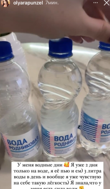 Бывшие участницы Дома 2 наперегонки начали худеть, чтобы доказать подписчикам, что они имеют силу воли, а затем рекламировать спортивные марафоны. Пришлось пойти по стопам бывших коллег и звезде проекта супруге Дмитрия Дмитренко, у которой нашелся свой способ сделать талию тонкой. Ольга Рапунцель раскрыла секрет своей волшебной диеты. Несколько дней она пьет только воду, по 3 литра в день (не советуем повторять эту методику), затем переходит на растительную пищу.