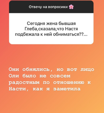 В ближайшее время узнаем, расстались ли Настя и Глеб, как мы уже рассказывали на шлоке, мама девушки - Наталья переживает за свою дочь, но никак не может на неё повлиять. Остается только ждать, пока пара распадется по разным причианм, Глеб же не собирается жениться на Анастасии?