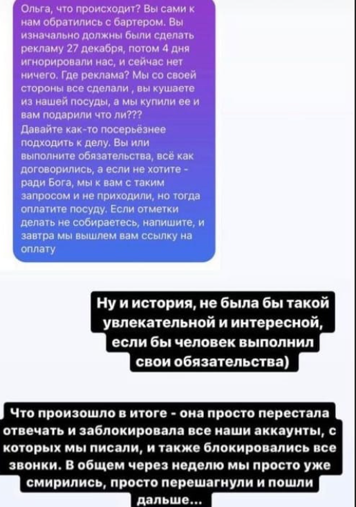 У бывшей участницы Дома 2 произошел очередной конфликт с заказчиками, после которого по сети разлетелись негативные отзывы про её работу в Инстаграм. Ольгу Рапунцель снова обвинили в мошенничестве и некачественной рекламе. По словам рекламодателя, Ольга обратилась к ней перед Новым годом, увидев на её странице красивую посуду, набрала у неё тарелок и сервировочных принадлежностей, коробки сложила под ёлкой, поставила посуду на стол, хвасталась в сторис красивыми чашками и блюдами, а ссылку подписчикам не оставила, якобы купила сама.