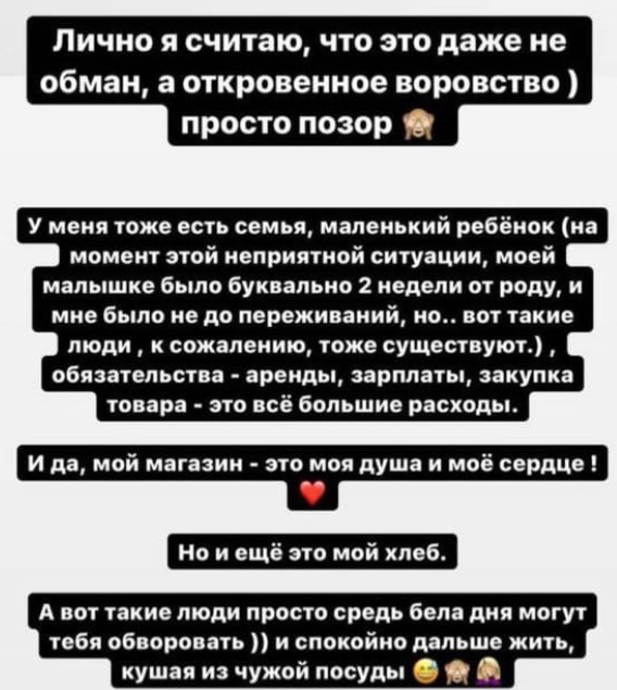 Когда женщина начала спрашивать у Рапунцель, будет ли обещанная ссылка на её товар, ответа не было, затем начались пререкания, и заказчица обвинила бывшую участницу Дома 2 в краже и обмане, но заявление в суд не подала, чтобы не трепать себе нервы.