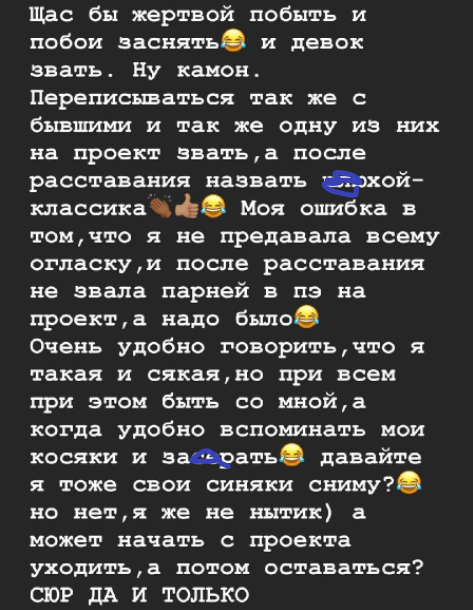 Балыкин говорит, что ему изменили, но была только переписка в начале их отношений, а та легкодоступность Алёны, которая ему якобы мешает, помогла Никите пробиться на проект и закрепиться, заявить о себе. Скандал в этой паре увидим в эфирах 20.02.2022 и обсудим на шлоке, кто из них прав, а кто виноват. Хотя... Два сапога пара?