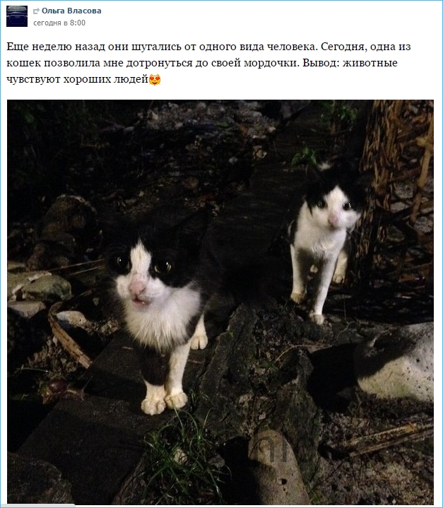 Еще неделю назад они шугались от одного вида человека. Сегодня, одна из кошек позволила мне дотронуться до своей мордочки. Вывод: животные чувствуют хороших людей
