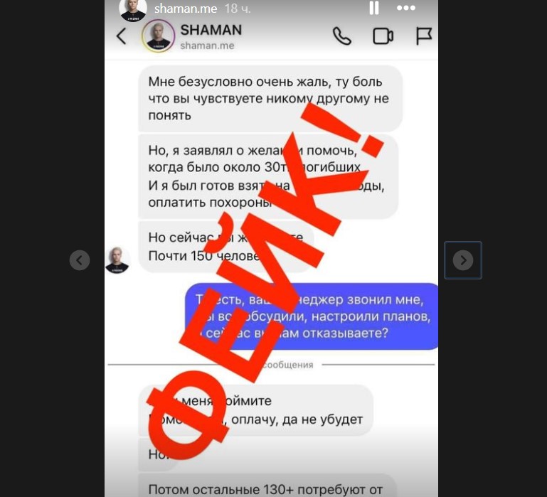 Напомним, на выложенных кем-то скринах певец Shaman выражает готовность помочь каждому пострадавшему, но в тот самый момент, когда этих пострадавших становится на порядок больше, отказывается от помощи. По "его" заверениям, он был готов помочь, когда число пострадавших исчислялось 30 погибшими, но когда оно перевалило за сотню, "признался" - всем помочь не в его силах. "Я заявил о желании помочь, когда было около 30 погибших… Но сейчас, вы же видите, почти 150 человек… Я не готов сейчас", - приводит "его" слова ряд изданий.