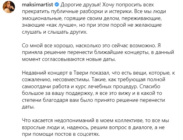 "Со мной все хорошо, насколько это сейчас возможно. Я приняла решение перенести ближайшие концерты, в данный момент согласовываются новые даты. Недавний концерт в Твери показал, что есть вещи, которые, к сожалению, несовместимы. Такие, как требующая полной самоотдачи работа и курс лечебных процедур. Спасибо большое за вашу поддержку, я все это вижу и в какой то степени благодаря вам было принято решение перенести даты. Что касается недопониманий в моем коллективе, то все мы взрослые люди и, надеюсь, решим вопрос в диалоге, а не при помощи постов в соцсетях.", - написала на своей официальной странице Марина Максимова.