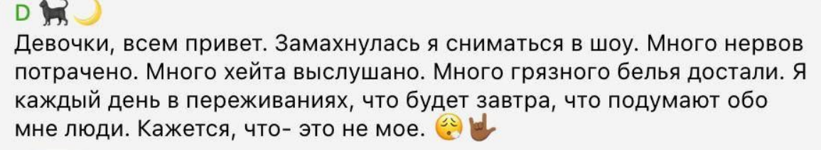 Дарье не нравится то, что её прошлое на проекте хотят предать огласке, а некоторые поклонницы Элины Рахимовой распространяют фото по телеграм-каналам и обсуждают её фигуру и внешние данные.