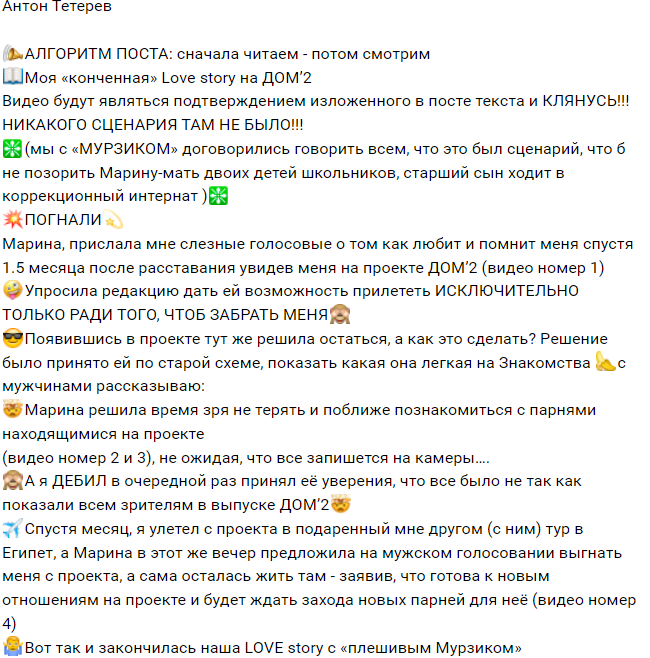 Сложно поверить, что у пары Марины и Антона нет сценария, с помощью которого они развлекают телезрителей, кто-то же подобрал ему нужные нарезки и кадры для блога. Ждем на шлоке ответ Марины на выпады Тетерева. Разве сценаристы Дома 2 могут выгнать такого "перспективного" участника, как Антон?