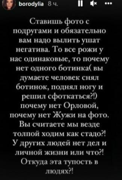 "Ставишь фото с подругами и обязательно надо вылить ушат помоев. То рожи у нас одинаковые, то почему нет одного ботинка, почему нет Орловой, почему нет Жужи на фото? Вы считаете, мы везде ходим толпой, как стадо? У других людей нет дел или личной жизни, или что? Откуда эта тупость в людях?" - сорвалась Ксения на поклонников, припомнив все упреки своих антифанатов.