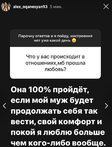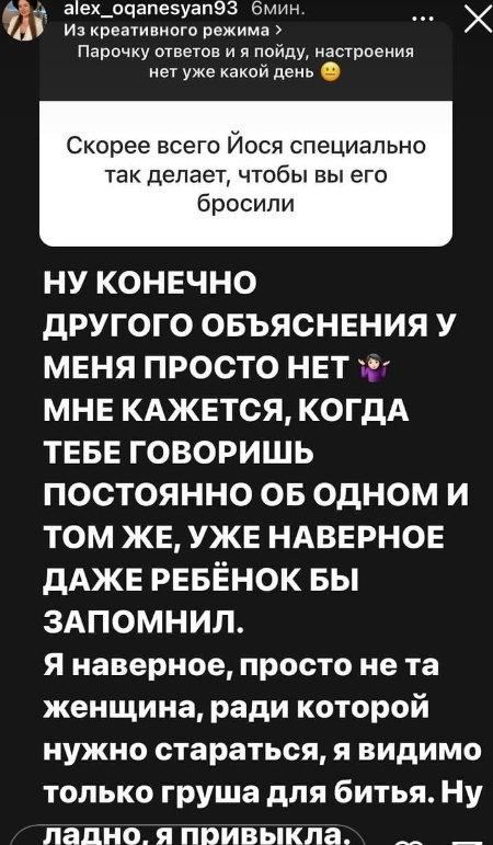 У бывшей участницы Дома 2 накопилось много претензий к Иосифу и она угрожает ему разводом, потому что ей хочется жить в комфортных условиях, на первом месте у неё позитивная атмосфера, что никак не сочетается с тем, что нужно заниматься домом и ребенком, контролировать мужа и сестру, искать новую съемную квартиру и вести блог. А вместо этого - поиск няни, о чем мы писали на шлоке, и разборки с мужем, который пытается сбежать к родителям.